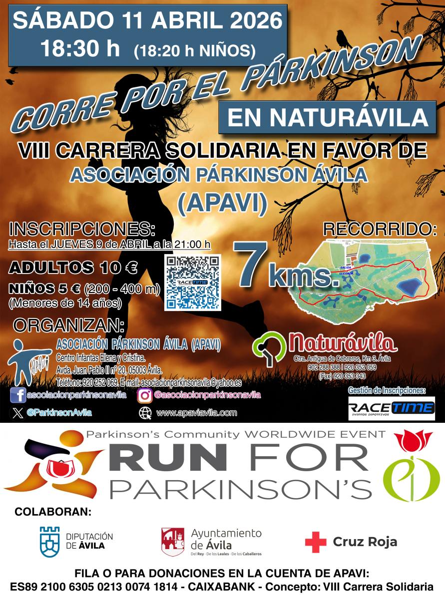 Vuelve el mes de abril, el mes del Parkinson y con él una nueva edición de la CARRERA SOLIDARIA. El próximo SÁBADO 11 DE ABRIL de 2026, a las 18:30 HORAS(18:20 h. para los niños), os esperamos un año más en las instalaciones de Naturávila (Carretera Antigua de Cebreros, Km3, 05003 Ávila).